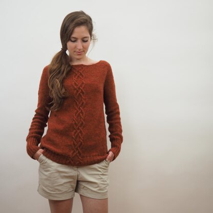 BROOKE is knit in reverse stockinette stitch, seamlessly from the top down. Increases for the circular yoke are worked nearly unvisible. Beautiful detail on front and back: the double cross pattern with cables.