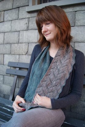 Brooklet is a versatile long cowl in 2 colors that may be worn long and open, wrapped twice around the neck, or folded and looped through. It is worked in one piece in the round in stockinette stitch in one color for the inside then continued in the round in a simple lace pattern in a second color for the outside.