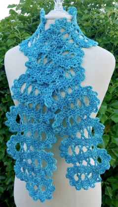 A nod to the ruffles often seen on lady’s blouses in the 1920’s, our “Jabot” uses Bruges lace to create a ruffled scarf to keep your neck warm. Bruges Lace is made with very short rows with chain loops on the sides which are joined to future rows to shape the lace into a wavy loop pattern. Leaving one loop open allows you to pull the long end through, securing it around your neck.
