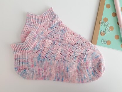 Bubble Gum Shorties are cuff down socks that feature a simple lace pattern on top of the foot.