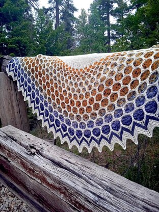 This shawl was designed to show off the beauty of slow color-changing gradient yarn. I tried to keep the pattern as simple as possible this time; the graduated bubbles are worked with slipped stitches with some increases without any complicated techniques involved.
