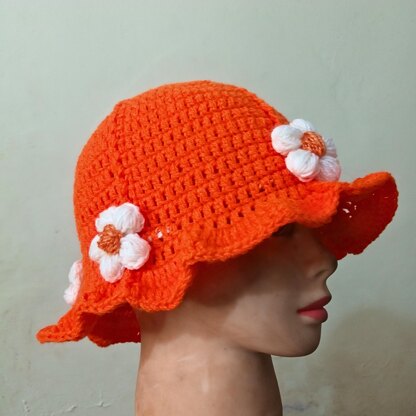This is a Crochet Pattern for a Basic Bucket Hat beautifully adorned with Puff Flowers
