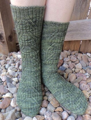 This sock was designed for my dad. The stitch pattern uses lace to keep them stretchy, but the eyelets can also be closed up by working them through the back loop to make the socks more “masculine”.