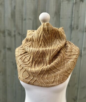 Buckthorn Lane is a large cowl knit from the top down featuring delicate cables and twisted stitches.