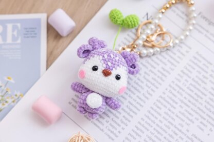 Materials Needed: Edelweiss yarn #2: light purple #12 (one ball); white #09 (10 grams) 4-ply milk cotton: mustard green #25 (5 grams); Four 6 mm black flat bottoms safety eyes One 7 x 9 mm brown nose One golden lobster key chain One imitation pearl bracelet A circular pink non-woven fabric with a diameter of 4 cm Filling cotton (10 grams) Yarn needle Stitch marker Alcohol glue 2.0 mm crochet hook