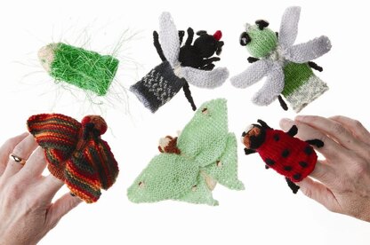 Doesn’t everyone need a buddy? These finger puppets, made from a variety of fingering weight yarns on size 1(2.25mm) and size 2 double pointed needles, are just right for bug enthusiasts of every age. Knit Doug the Dragonfly Dude, Carl the Caterpillar, Lacey the Ladybug, Buck the Butterfly, Manny the Mosquito and Luna Moth for hours of creepy crawly knitting and play pleasure. Use scraps leftover from your sock knitting, or purchase yarn colors to match your local fauna. I consulted field guides, along with a convenient butterfly geneticist, in order to offer you puppets that look a lot like the real thing!