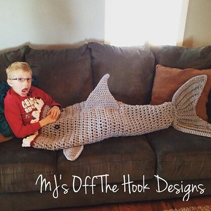 This is a PDF crochet pattern for a soft bulky shark blanket! Perfect to cozy up with on the couch. I designed this blanket for my son as a boy version of my Bulky & Quick Mermaid Blanket. It is designed to cocoon around the calves and feet. I designed this pattern to work up quick. It’s a simple design suitable for a beginner. The body of the blanket uses 2 strands of bulky weight yarn with a Q hook. The fins are made using 1 strand of bulky weight yarn with a 9mm hook. The pattern includes preschool-adult sizes with modifications to make infant sizes