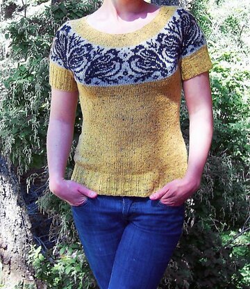 This short-sleeve, circular-yoke sweater is seamless, - therefore it's very fast to knit, and requires almost no finishing. Because of the chart complexity, I can only offer it in three sizes. With suggested gauge, it should fit 32, 34 or 36 bust circumference. You can definitely make it larger with larger needles and thicker yarn.