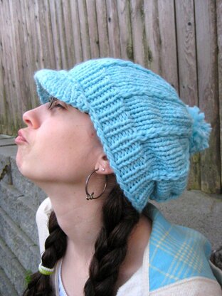 Bum-Diddy is a casual newsboy style slouchy hat. It begins with 1x1 ribbing before changing to a slipped stitch stockinette pattern. Topping it all off is a large pom pom.