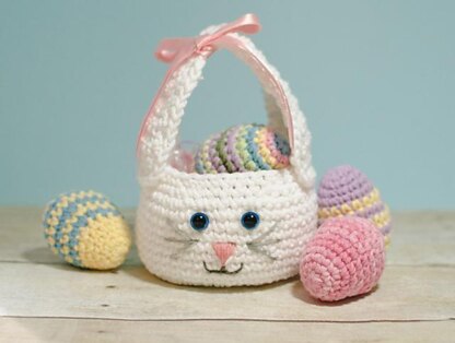 A darling little bunny basket to fill with Easter treats! This Easter bunny basket crochet pattern is quick and simple to work up and features long bunny ears that double as a handle. Enjoy adding your own embellishments and personalizing your bunny's face.