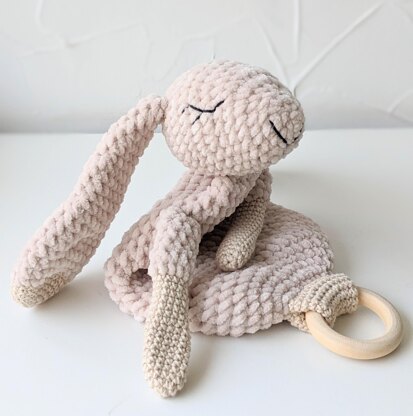 Perfect for any baby, lovey and teether in one! Made with two different types of yarn – two different textures to explore. Very soft and super cuddly.
