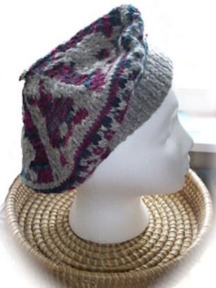 a cadet style cap in 2 colors using fair isle charted technique with a soft short row brim. Made all in one piece.