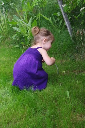 Bunny Hop is knit circularly in one piece from the top down. The yoke features butterfly stitch accents on the front and is ribbed on the back. Instructions are included for the elasticized I-cord straps which will stay in place as your little one searches for bunnies under the shrubs.