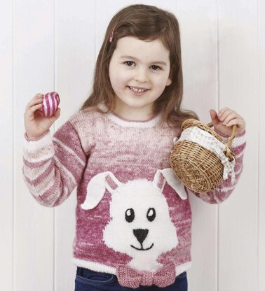 Bunny hop is bottom up, seamed sweater with a drop shoulder and intarsia motif. Cute bunny ears are knitted separately and sewn on, along with the eyes, nose and bow tie. What a show stopper.