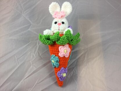 This is a pattern for a little bunny peeking it's cute little head from the top of a carrot :). She is 11" tall (from the bottom of the carrot to the tops of the ears). She would be perfect to tuck into an Easter Basket. If you are an experienced crocheter you can whip her up in a few hours :)