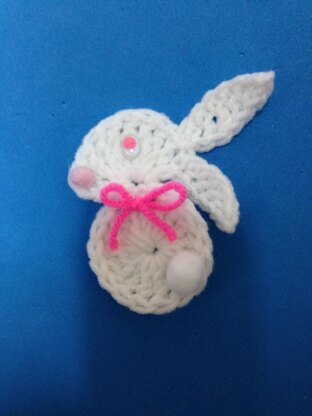 This cute little bunny pin can be made in just a few minutes using basic stitches and just a small amount of worsted weight yarn. You could also make it into a magnet, or use it as an applique. It is about 3” tall