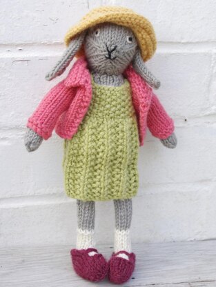 Howmuch yarn do I need? For the rabbit herself, you'll need 32m/35yds in your main colour plus 15m/16½yds of yarn in two different colours for the vest and pants. These are knitted as part of the main rabbit. Other items knitted from oddments of various lengths. You'll also need very small quantities of black and white yarn to embroider the features.