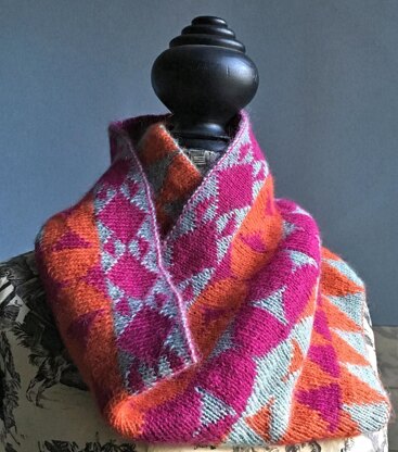 The pattern uses double knitting technique, working with two strands of yarn throughout to produce two layers of stockinette back to back, with the reverse side of the cowl being the mirror image (in terms of colour) of the front side. Basic instructions are given in the pattern but if you are new to this technique it is recommended that you view available online tutorials and work a practice swatch. Some links are available on the Skein Reaction website to assist with this.