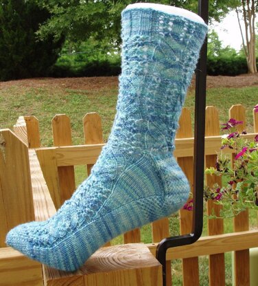 This is a lace sock that can be knit from the toe up or from the cuff down, with a slip stitch heel. There are 2 sizes. Small is a 66 stitch leg, Medium is a 72 stitch leg. There is an option to do the toe in an eye of partridge stitch.