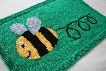 The blanket is knitted in one piece with the bee being incorporated using the intarsia technique. The flight path can either be knitted as you go or stitched at the end using duplicate stitch. A moss stitch border is knitted while you work the rest of the blanket, resulting in minimal finishing being required. The bee and flight trail are worked from clear, numbered charts.