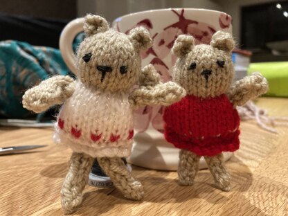 Everyone loves teddy bears and these busy little bears will instantly appeal to all ages. Measuring just 10 cm (4 in) they are small enough to fit into a pocket. Knitted on two 2.75 mm needles (US 2) they are quick to make and will utilize lots of short lengths of yarn.