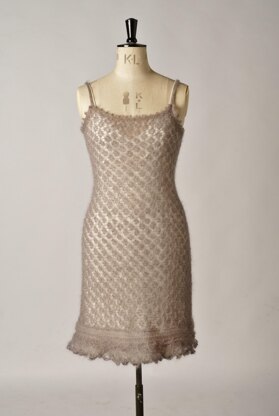 Butterfly dress is a delicate, lacy slip dress knitted in a fine mohair yarn on relatively large (UK 5mm/US 8) needles. The lace stitch of the body is a simple 8-row repeat, and the frill is made up of 2 layers of edging knitted lengthways. The body is decorated with small glass beads, threaded onto the yarn before knitting, and placed randomly over the dress. The pattern contains both written instructions and charts for the lace stitch and bead placement. The pattern also contains instructions for the vest version, which is shorter and has just one frill. Both garments are made by knitting the frill first, then picking up stitches from along its edge to start the body. The pattern also contains images of the the stitch details.