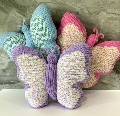 **BUTTERFLY SPRING SPECIAL! 100 free downloads!**Follow me on Facebook ‘Carol Connelly Knits’ for links to future Ravelry promotions. The pattern is for a knitted Butterfly shaped Cushion. It is ideal for children over 3 years of age, teenagers and adults. The materials used are soft and snuggly, ideal for the lounge or bedroom. 5mm needles are used throughout. You will need 2 balls altogether, 1 each of contrasting King Cole Yummy yarns. I used the following:- Lilac Cushion, 3462 Lilac and 3370 Tutti Frutti Blue Cushion, 2222 Sky and 2211 Jelly Bean Pink Cushion, 3463 Sugar Pink and 2214 Battenberg You will need toy stuffing for the filling. If you wish to make the antennae you will need a white pipe cleaner and narrow double sided tape. Also 3 x 2cm to 2.5cm matching buttons. The finished Butterfly Cushion measures approximately 44cm wide, 42cm long and 10cm deep when stuffed.