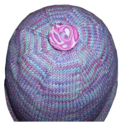 This simple roll-brim pattern in child to adult sizes, is topped off with a button for accent. Single yarn throughout (solid or handpaint), or 2-yarn stripe.