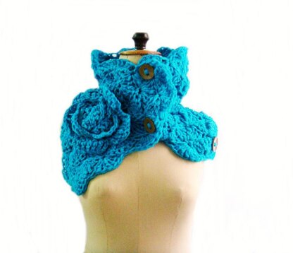 Crochet pattern for button up cowl with 3 buttons and huge flower pin. The buttons can be slipped through the stitches and you can adjust the size of the cowl.