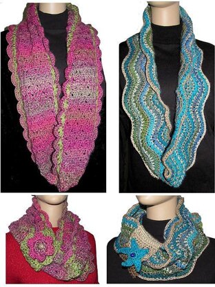 These fun and fashionable infinity cowls can be worn as a long scarf, or doubled up and cinched with their Starfish and Flower button bands.