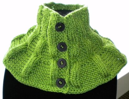 A knitted button-up scarflette /neck warmer. This scarflette/neck warmer is so versatile. It may be worn under or over a coat or jacket and also looks very pretty worn over any style top. Made with a soft acrylic yarn. One Size Fits Most 15” circum (neck) x 8” long. (to increase size, use larger size needles). Skill Level: Easy. Knitting Needles: US 8