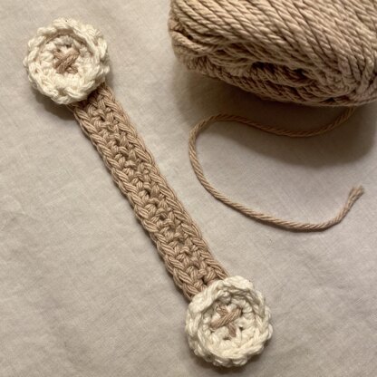 Dedicated to all those essential workers out there, and all yarn, no buttons, to make it easier to make straight from your stash. These need to be able to be washed without losing shape or wearing thin, so a cotton yarn is recommended, but not required. You can use a different weight yarn, just make sure the band is long enough and the buttons big enough to fit the purpose.