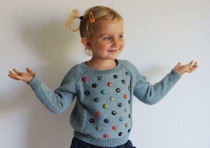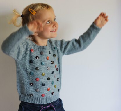 This super fun sweater is knit in the round from the top down. The yoke is shaped with raglan increases. Buttons are added onto the front of the sweater with a seamless method using a crochet hook. The sleeves are worked in stockinette stitch in the round. The hem and cuffs are finished with 1 x 1 ribbing. The number of buttons needed will depend on how long you decide to make the sweater. The numbers listed are for the given lengths at the correct gauge.