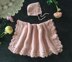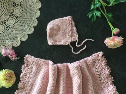 Construction: The blanket is knitted diagonally, from corner to corner. Crochet border is worked in the round. Bonnet is knitted flat, and seamed in the back. Crochet border and edging is made in the round. Cord ties are made using crochet cord technique.