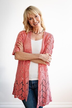 This stunning oversized cardigan seamlessly transitions from an easy leaves pattern worked until the underarm to an elegant filet crochet pattern. With a flattering v-neckline and charming three-quarter length sleeves, it combines simplicity and sophistication for a fashionable and cozy wardrobe addition.