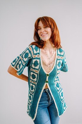 This captivating cardigan starts with stunning motifs worked from the front to the back, creating a flattering V-neckline. Delicately crafted in filet stitch, the sides feature graceful slits for movement. The sleeves echo the motif’s beauty, while the rest continues seamlessly in filet crochet, showcasing an intricate yet cohesive design. Crocheters are invited to explore filet crochet’s artistry, mastering techniques for a sophisticated garment.