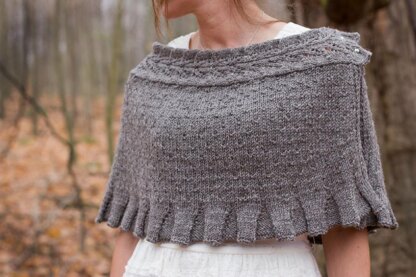 A capelet knit as a large rectangle. The sample shown was knit in Confection Worsted, by Bare Naked Wools, shade Milk Chocolate. A substitute yarn is recommended below.