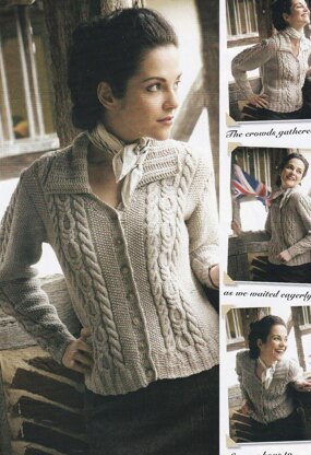 This is a pattern for a Cable and Moss Stitch cardigan, originally published in Knitting magazine, in Feb 2010 Land Girls issue. It has a cable and moss stitch pattern and a collar. Photos Laurel Guilfoyle for Knitting magazine.