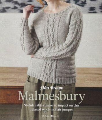 This is a pattern for a Cable and Ridges Jumper, originally published in The Knitter. It has a swinging cable at the centre, with a smaller twist cable either side, and garter stitch ridges repeated at the sides. Photos The Knitter.