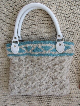 This is a cable and triangles bag, originally published in Simply Knitting issue 157. It has an all over cable with an intarsia border. Inside it has lining and wadding, and is finished with faux leather handles.