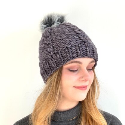 A stylish cable hat in super-chunky/super-bulky yarn - fashion and warmth in those cold, winter winds. A fluffy pompom tops it off nicely.
