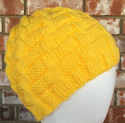 The stitch pattern when un-stretched, gives the illusion of cables, but there are no cables. It’s the placement of blocks of knitted stitches is what produces the effect. This pattern is fun to do and the hat works up quickly.
