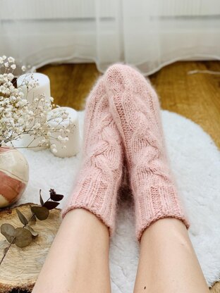 Pattern in English, US knitting terms Skills: knit, purl I used circular needles 80 cm long. But you can easily adapt it to set 4 Double Pointed Needles Pattern include with more yarn suggestions. You can use any yarn close to parameters The pattern includes step-by-step instructions, video tutorials for each step, and a cable pattern chart. The pattern includes three sizes. All sizes and the number of skeins are written in the table with measurements of calf, foot. Picture size XS / Model size XS-S Easy to adjust foot length to fit your size.