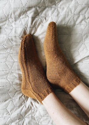 These ankle socks are worked cuff-down. A heel is worked with German short rows with a small gusset worked with increases along both sides of the heel every round. Foot and toe are worked in rounds while toe is shaped with decreases and seamed with The Kitchener Stitch.