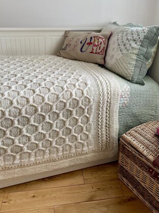 The Cabled Trellis Blanket is all about cables! It is cosy and snuggly and looks absolutely stunning. The blanket features simple eyelet pattern on all sides and basic cables in the centre, which give a textured finish.