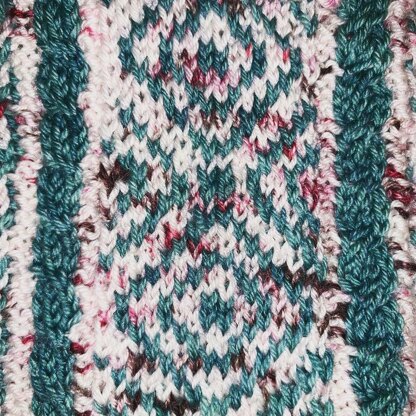 This pattern is charted and is knit in the round. My knit techniques used for this design are Fair Isle and Cables. The pattern is currently written for one size, but can easily be edited for a larger size by adding extra stitches before and after the cable sections, and cen be decreased in size by removing a purl stitch from before and after the cable sections.