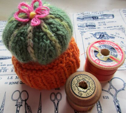 This is a pattern for a cactus pin cushion. It is made in two parts. The pot has a circular base with rib sides, and the plant is in stocking stitch shaped at the top. The plant has embroidery, with an embroidered flower on the top. Small amounts of dk yarn are used.