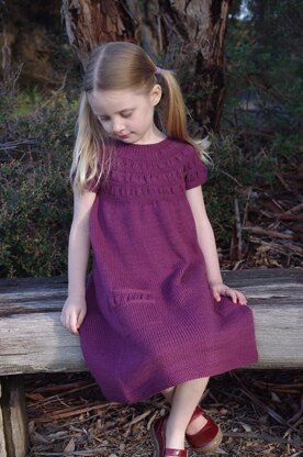 Construction:  This delightful dress is knit from the top down beginning with a flat back-buttoning yoke featuring three buttons. Once the yoke is joined, the rest of the dress is knit seamlessly with the armbands also knit in the round. The patch pockets are picked up from the body of the garment and sewn into place, once knit.
