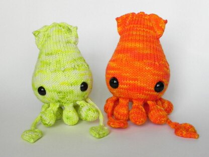 Size: The squid stands approximately 6” tall, when knit in worsted weight yarn and 5" tall knit in DK/Light Worsted