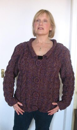 First size shown will fit from 38 to 44 bust, 2nd size from 46 to 50 bust, due to the ribbed panels. length 26 ins (69 cm) Sleeve 17.5ins (45cm). Large buttons (or large Dorset Buttons as shown)